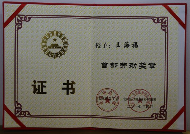 近日,我校机电学院王海福教授荣获2017年“首都劳动奖章”。
